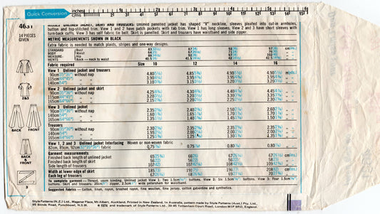 Patrón de costura vintage de los años 70, chaqueta con puños, falda y pantalones para mujer, estilo 4631, talla 12, busto 34 pulgadas