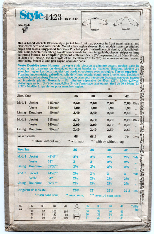 Patrón de costura vintage de los años 80 para chaqueta bomber retro de hombre estilo 4423, pecho de 38 pulgadas, sin cortar, doblada de fábrica