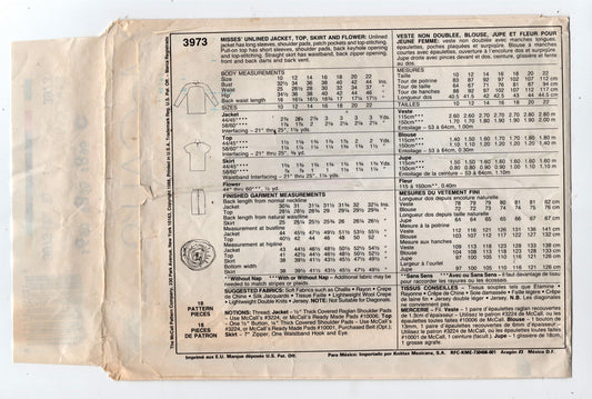 Patrón de costura McCall's 3973 para mujer, chaqueta, falda y flores, estilo vintage de los años 80, tallas 6 a 14, sin cortar, doblado de fábrica