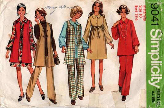 Patrón de costura vintage de los años 70 para vestido de maternidad con mangas abullonadas Simplicity 9041, chaleco y pantalones, talla 10, busto 32,5 pulgadas
