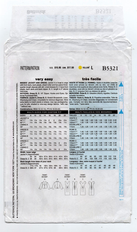 Patrón de costura de vestido y chaqueta con corpiño plisado para mujer Butterick B5321 EASY, agotado, tallas 16 a 22, sin cortar, doblado de fábrica