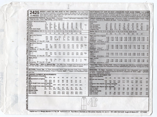 Patrón de costura vintage de los años 90 para blusa y falda con cuello cuadrado y botones laterales para mujer McCall's 2425, talla 16-20, doblado de fábrica sin cortar