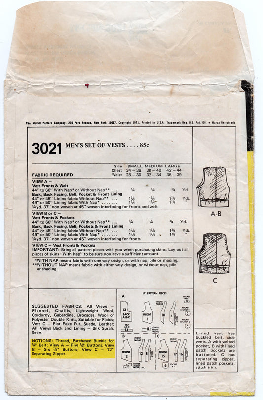 Patrón de costura de chalecos con forro retro McCall's 3021 para hombre, años 70, talla MEDIANA, pecho de 38 a 40 pulgadas