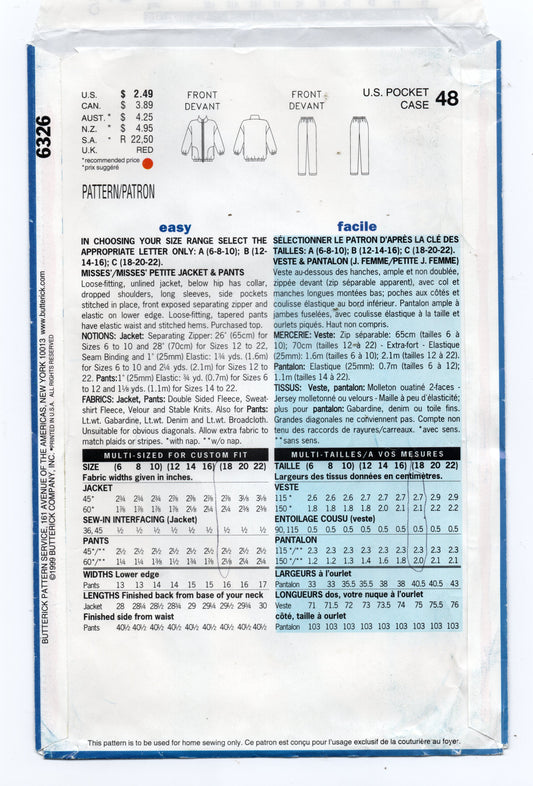 Patrón de costura Butterick See & Sew 6326 EASY para chaqueta y pantalones de polar para mujer, estilo vintage de los años 90, talla 18-22, sin cortar, doblado de fábrica