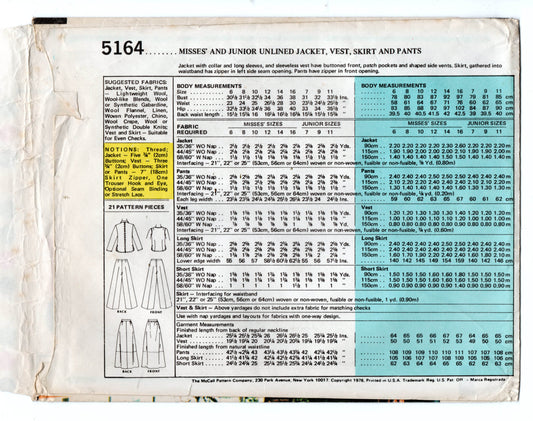 Patrón de costura vintage de los años 70 para chaqueta, chaleco, falda y pantalones de McCall's 5164 Marlo's Corner para mujer, tallas 8 a 12, sin cortar, doblado de fábrica