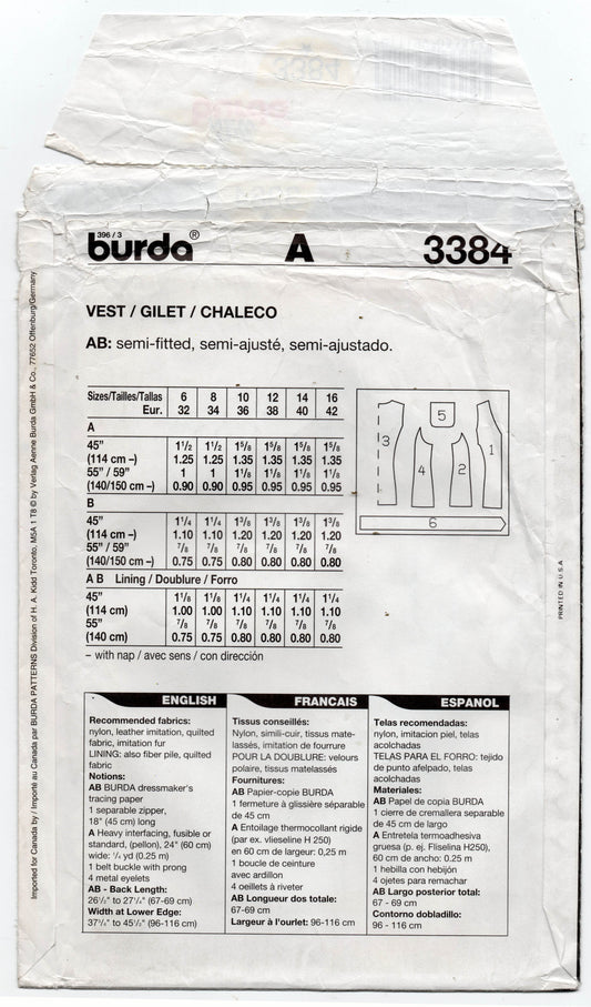 Patrón de costura Burda 3384 para chaleco con cremallera frontal o chaleco acolchado para mujer, años 90, tallas 6 a 16, doblado de fábrica, sin cortar