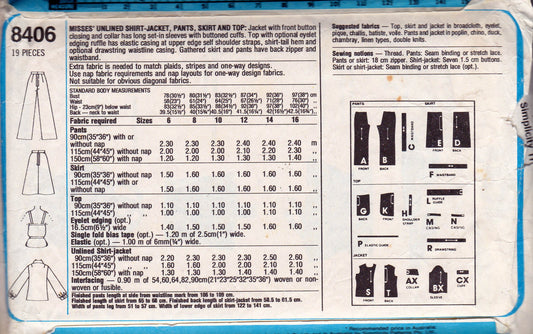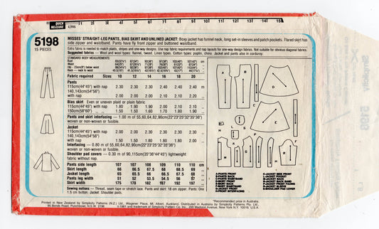 Patrón de costura vintage de los años 80 Simplicity 5198 para chaqueta, pantalón y falda con cuello de embudo para mujer, talla 12, sin cortar, doblado de fábrica