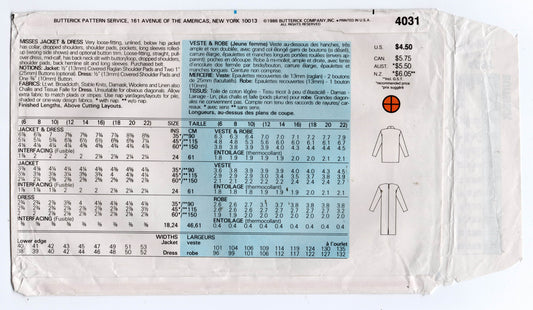 Patrón de costura Butterick 4031 para vestido y chaqueta estilo capullo para mujer, estilo vintage de los años 80, talla 6 a 10, sin cortar, doblado de fábrica