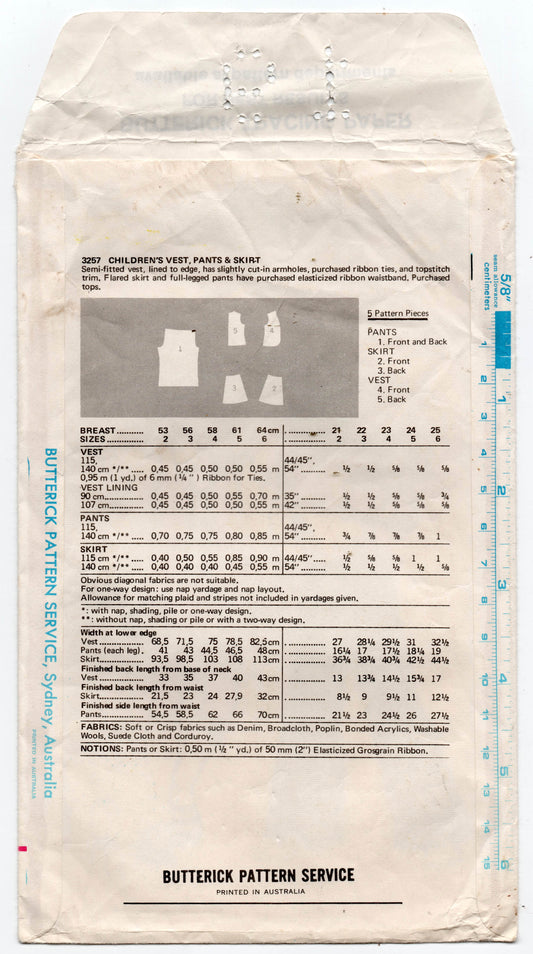 Patrón de costura vintage de los años 70 para pantalones y minifalda de niñas pequeñas Butterick 3257, talla 3