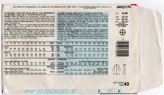 Patrón de costura vintage de los años 80 para chaqueta y pantalones con drapeado delantero para mujer Butterick See & Sew 6905, tallas 16 a 24, doblado de fábrica y sin cortar