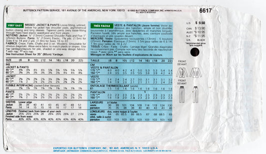 Butterick 6617 JESSICA HOWARD Patrón de costura de chaqueta y pantalones asimétricos para mujer, estilo vintage de los años 90, talla 6 a 10, sin cortar, doblado de fábrica