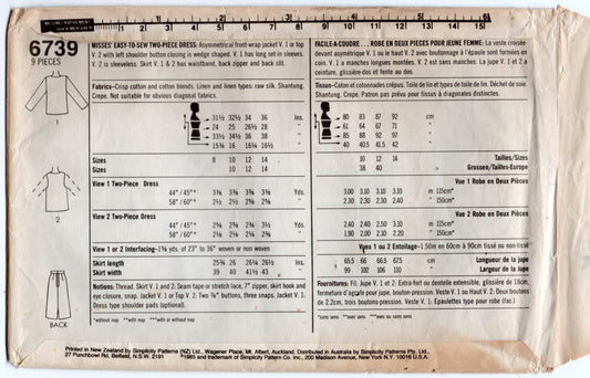 Patrón de costura vintage de los años 80 para chaqueta y falda cruzada asimétrica Simplicity 6739 para mujer, talla 12, busto de 34 pulgadas, sin cortar, doblado de fábrica