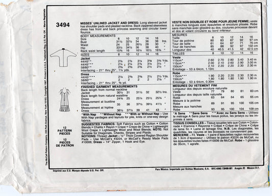Patrón de costura vintage de los años 80 para vestido y chaqueta de princesa con cintura caída para mujer McCall's 3494 LIZ CLAIBORNE, talla 12, sin cortar, doblado de fábrica