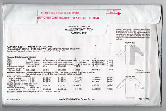 Patrón de costura vintage de los años 90 para cárdigans largos elásticos para mujer Kwik Sew 2081, tallas XS a XL, sin cortar, doblado de fábrica