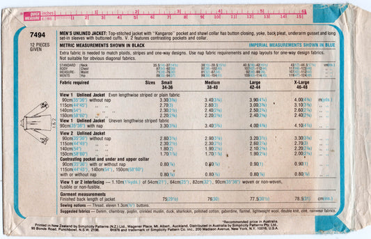 Patrón de costura vintage de los años 70 para chaquetas hippies retro de Simplicity 7494 para hombre, GRANDES, pecho de 42 a 44 pulgadas, SIN CORTAR, dobladas de fábrica
