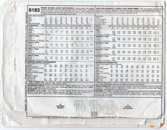 Patrón de costura vintage de los años 90 para vestido de mujer con pliegues y chaqueta 6183 de McCall, talla 8 a 12, sin cortar, doblado de fábrica