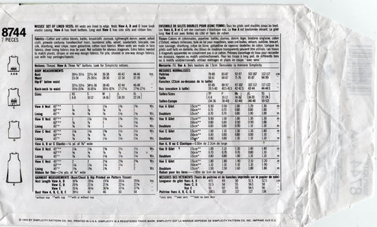 Patrón de costura Simplicity 8744 EASY para chalecos y chaquetas de mujer, años 90, tallas XS a M, sin cortar, doblado de fábrica