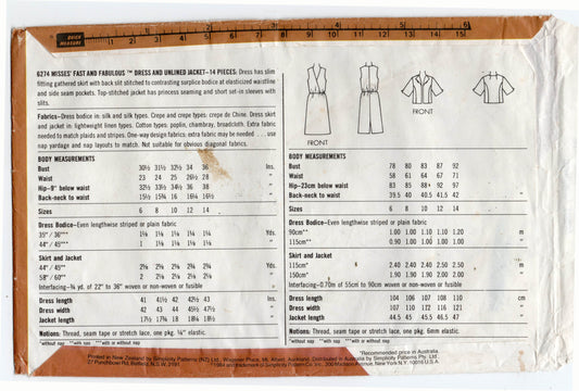 Patrón de costura vintage de los años 80 para vestido y chaqueta con corpiño cruzado para mujer Simplicity 6274, tallas 6 a 10 o 10 a 14