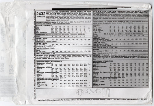 Patrón de costura vintage de los años 90 para chaqueta, top, falda y pantalones elásticos McCall's 2432 para mujer, talla 16-20, doblado de fábrica sin cortar