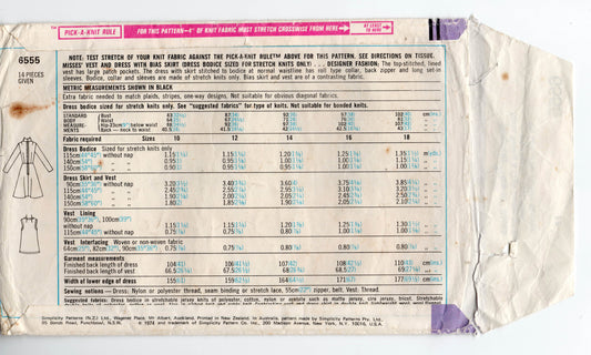 Patrón de costura vintage de los años 70 para vestido y chaleco ajustados elásticos de diseñador para mujer Simplicity 6555, talla 18, busto de 40 pulgadas