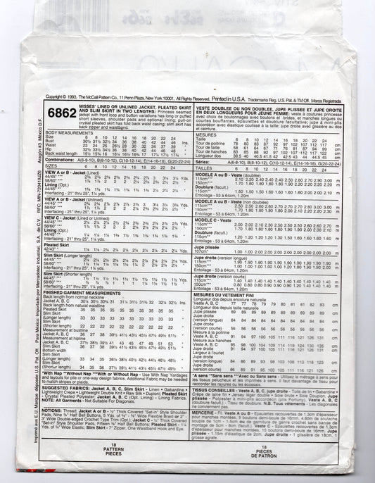 Patrón de costura vintage de los años 90 para chaqueta larga y falda recta o plisada para mujer McCall's 6862, talla 8 a 12, sin cortar, doblado de fábrica
