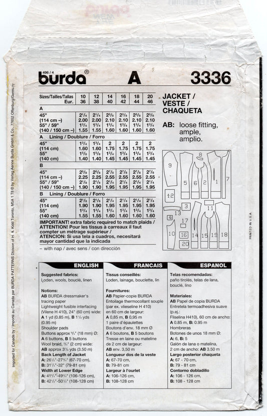 Patrón de costura Burda 3336 para chaqueta entallada sin cuello con ribete en contraste para mujer, años 90, tallas 10 a 20, doblado de fábrica y sin cortar