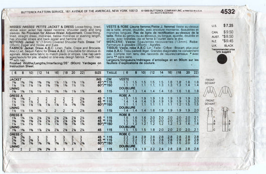 Patrón de costura vintage de los años 80 para vestido de noche ajustado y chaqueta bolero para mujer Butterick 4532, talla 6-10, sin cortar, doblado de fábrica
