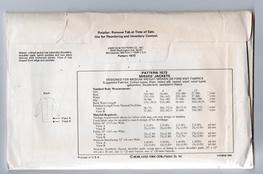Patrón de costura vintage de los años 80 para chaqueta blazer extragrande Kwik Sew 1572 para mujer, talla 6 a 12, busto de 32 a 37 pulgadas, sin cortar, doblado de fábrica