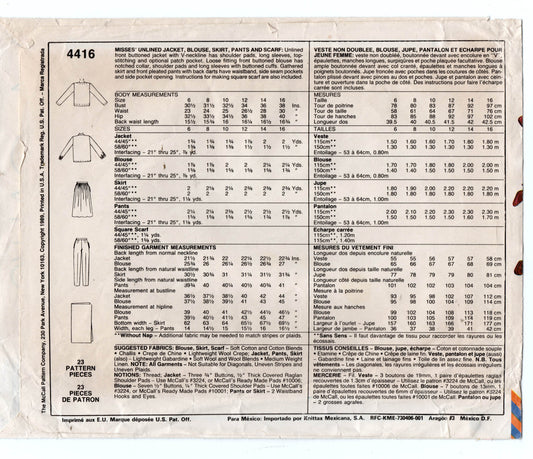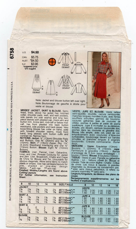 Patrón de costura vintage de los años 80 para chaqueta, blusa, falda, chaleco y pantalones plisados para mujer McCall's 4416, talla 8, sin cortar, doblado de fábrica
