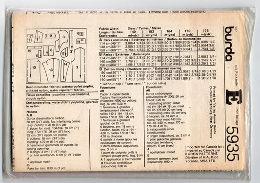 Burda 5935 Patrón de costura vintage de los años 80 para anorak y parka forrada para niños y niñas, tallas 10 a 16, sin cortar, doblado de fábrica