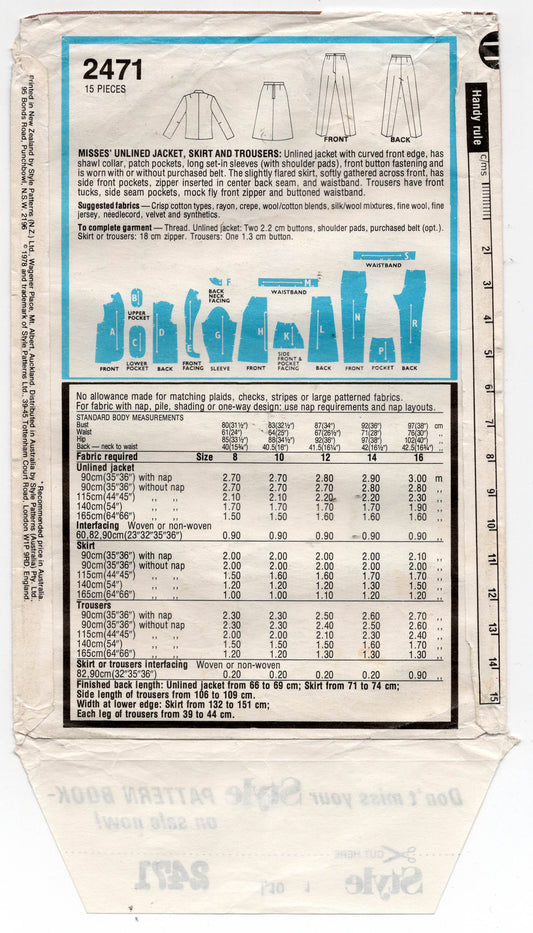 Patrón de costura vintage de los años 70 para chaqueta, pantalón y falda de mujer, estilo 2471, talla 10 o 12