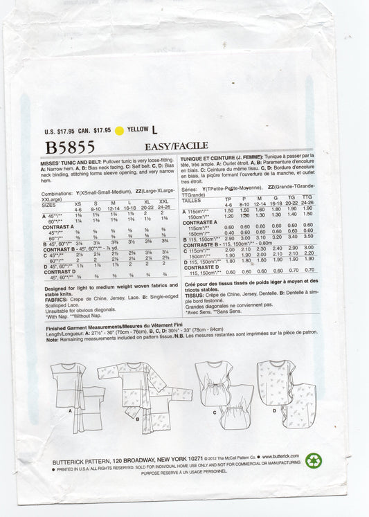 Patrón de costura de túnica caftán para mujer Butterick 5855, agotado, tallas L-XXL, sin cortar, doblado de fábrica