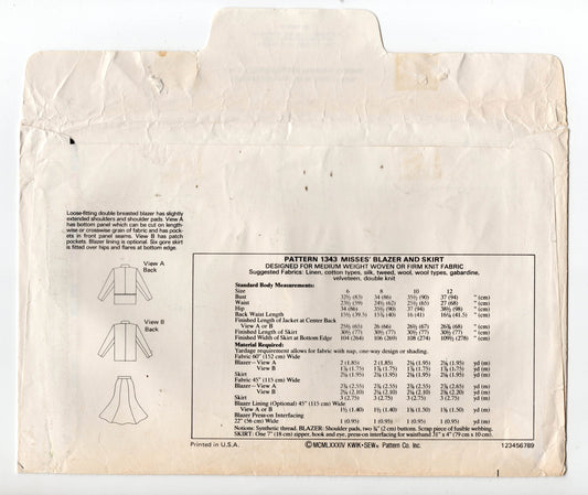 Patrón de costura vintage de los años 80 para chaqueta y falda larga Kwik Sew 1343 para mujer, busto de 32 a 37 pulgadas, sin cortar, doblado de fábrica