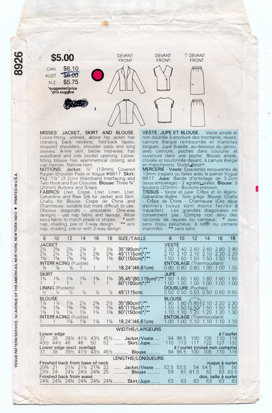Patrón de costura vintage de los años 80 para mujer, falda, traje y blusa cruzada, talla 12, busto de 34 pulgadas, sin cortar, doblado de fábrica, Vogue 8926