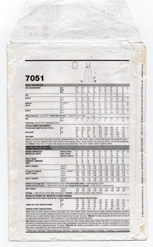 Patrón de costura Simplicity 7051 para vestido de verano y chaleco para mujer, década de 1990, talla 4 a 8, sin cortar, doblado de fábrica
