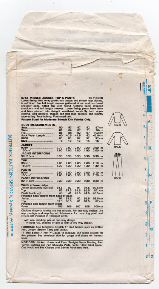 Butterick 6743 NANCY STOLKIN Patrón de costura vintage de los años 80 para chaqueta y pantalones elásticos para mujer, talla 14, sin cortar, doblado de fábrica