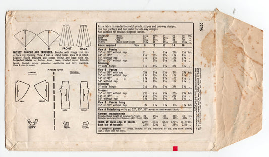 Patrón de costura vintage de los años 70 para poncho, pareo y pantalones de playa para mujer, estilo 2796, talla 12 o 14