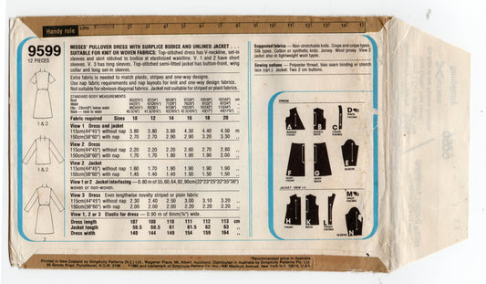 Patrón de costura vintage de los años 80 para vestido y chaqueta con corpiño cruzado para mujer Simplicity 9599, talla 12, sin cortar, doblado de fábrica