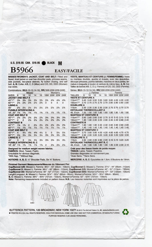 Patrón de costura de chaqueta y cinturón ajustados y acampanados para mujer Butterick 5966, talla 18-24, sin cortar, doblado de fábrica