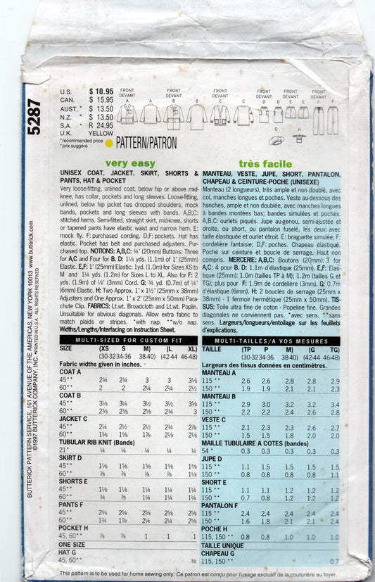 Bata de laboratorio y accesorios médicos unisex Butterick 5287 para hombre y mujer, patrón de costura vintage de los años 1990, talla XS a M, sin cortar, doblada de fábrica