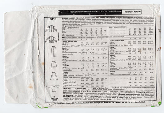 Patrón de costura vintage de los años 80, sin cortar, doblado de fábrica, para chaqueta, cinturón, camiseta, falda, pantalones cortos y pantalones cónicos, para mujer, modelo 9416 SHARI BELAFONTE-HARPER de McCall