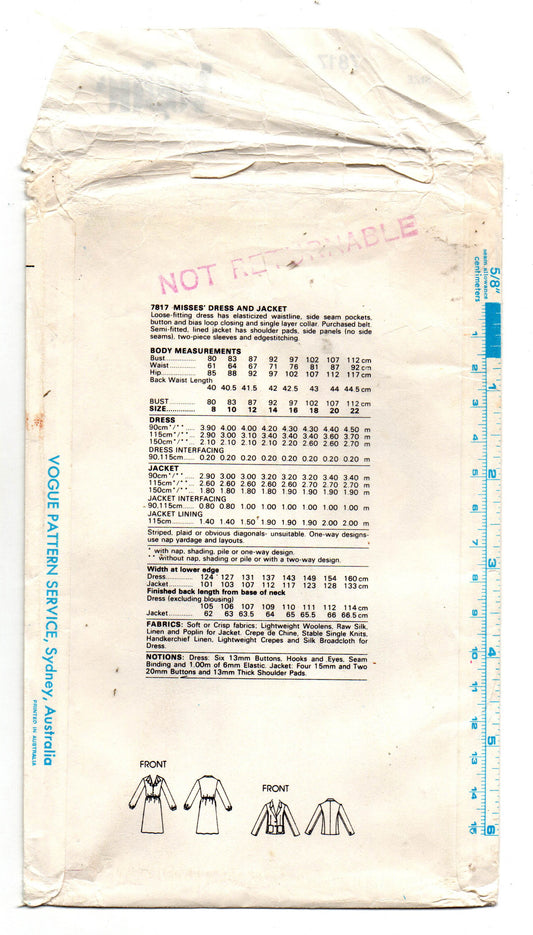 Patrón de costura vintage de los años 80 para vestido y blazer con volantes delanteros para mujer Vogue 7817, talla 10, busto 32 1/2 pulgadas, sin cortar, doblado de fábrica