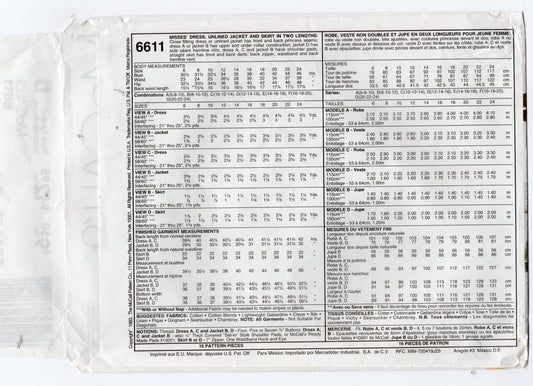 Patrón de costura de McCall's 6611 para vestido, falda y chaqueta sin mangas clásicos para mujer, de la década de 1990, talla 12 a 16, sin cortar, doblado de fábrica