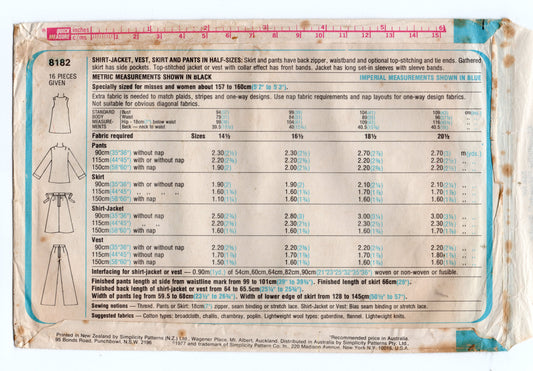 Patrón de costura vintage de los años 70 Simplicity 8182 para mujer, talla media, camisa, chaqueta, chaleco, falda y pantalones, talla 18 1/2, busto de 41 pulgadas, SIN CORTAR, doblado de fábrica