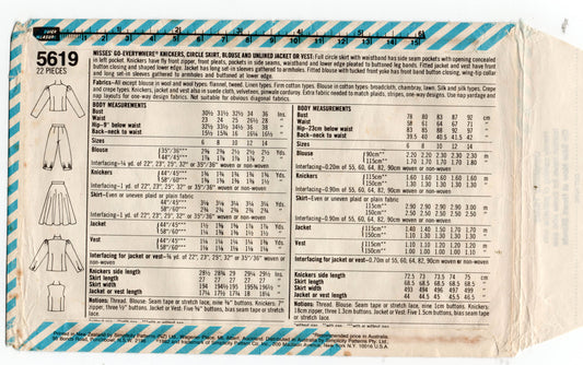 Patrón de costura vintage de los años 80 para mujer, sin cortar, doblado de fábrica, talla 12, blusa, chaleco y chaqueta, falda circular, bragas, Simplicity 5619