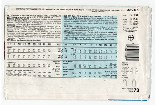 Patrón de costura vintage de los años 80 para mujer Butterick See & Sew 3321, traje con falda retro, talla 6-10, pliegues de fábrica sin cortar