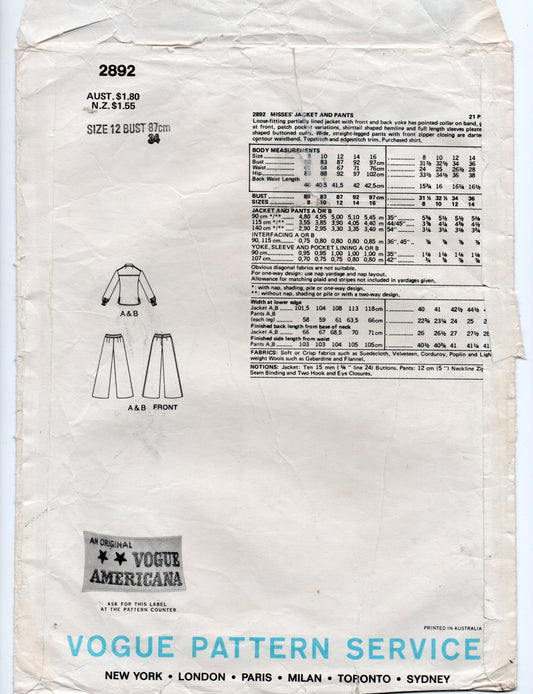 Patrón de costura vintage de los años 70 para chaqueta y pantalones acampanados de CHUCK HOWARD Vogue Americana 2892, talla 12, busto 34 pulgadas