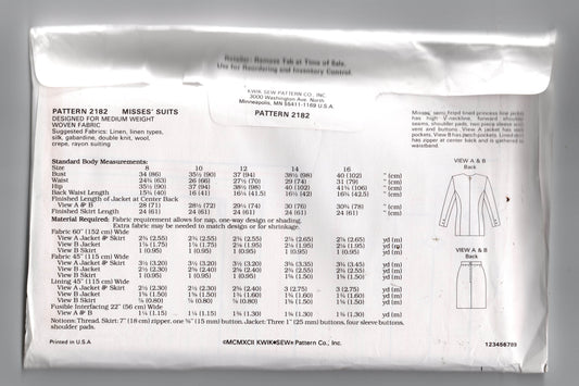 Patrón de costura vintage de los años 90 para trajes de falda para mujer Kwik Sew 2182, talla 8 a 16, sin cortar, doblado de fábrica