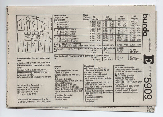Patrón de costura vintage Burda 5909 para traje de marinero para niños pequeños, años 80, tallas 2 a 6, sin cortar, doblado de fábrica