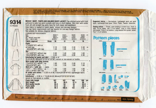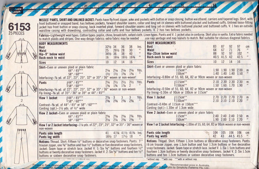Patrón de costura vintage de los años 80 Simplicity 6153 para mujer, pantalón cónico, camisa y chaqueta sin forro, JOHN WEITZ, talla 14, sin cortar, doblado de fábrica